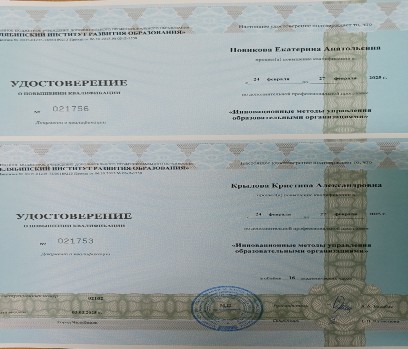 3. В рамках соглашения о сотрудничестве с ГБУ ДПО «ЧИРО» и с целью повышения квалификации членов рабочей группы РИП с 24.02 – 27.02.2025 г. руководитель МС Новикова Е.А. и заместитель директора по ВР Крылова К.А. прошли обучение по программе: «Инновационные методы управления образовательной организацией».